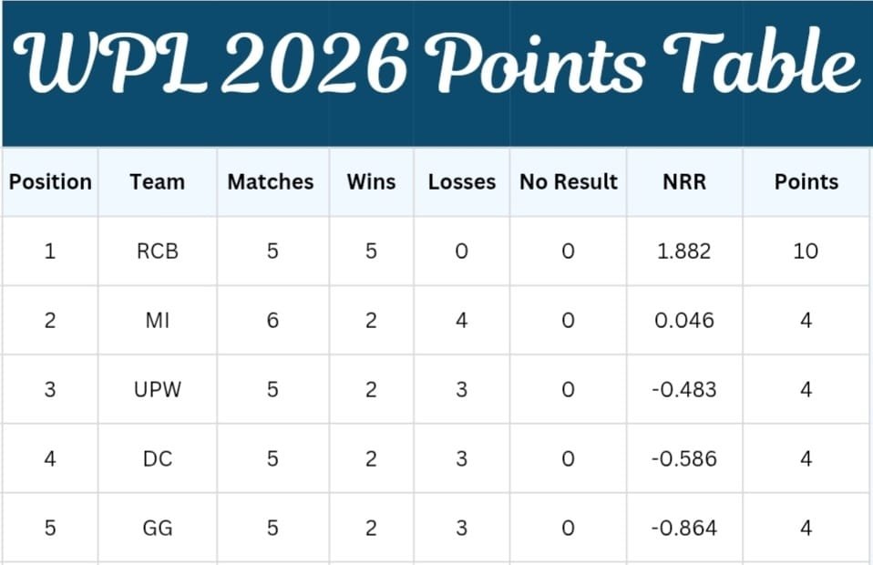 The Women’s Premier League 2026 points table tracks the performance of all five teams throughout the season, showing wins, losses, and accumulated points.